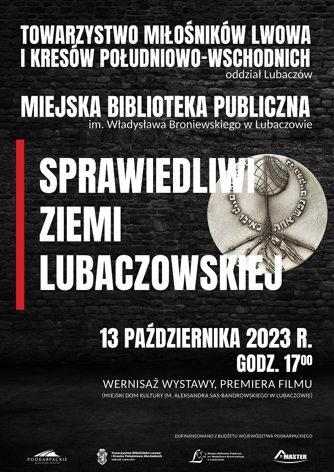 Towarzystwo Miłośników Lwowa i Kresów Południowo-Wschodnich o. Lubaczów oraz Miejska Biblioteka Publiczna im. Władysława Broniewskiego w Lubaczowie zapraszają na premierę filmu oraz wernisaż wystawy „Sprawiedliwi Ziemi Lubaczowskiej”, które odbędą się 13.10.2023 r. w Miejskim Domu Kultury im. Aleksandra Sas-Bandrowskiego w Lubaczowie.