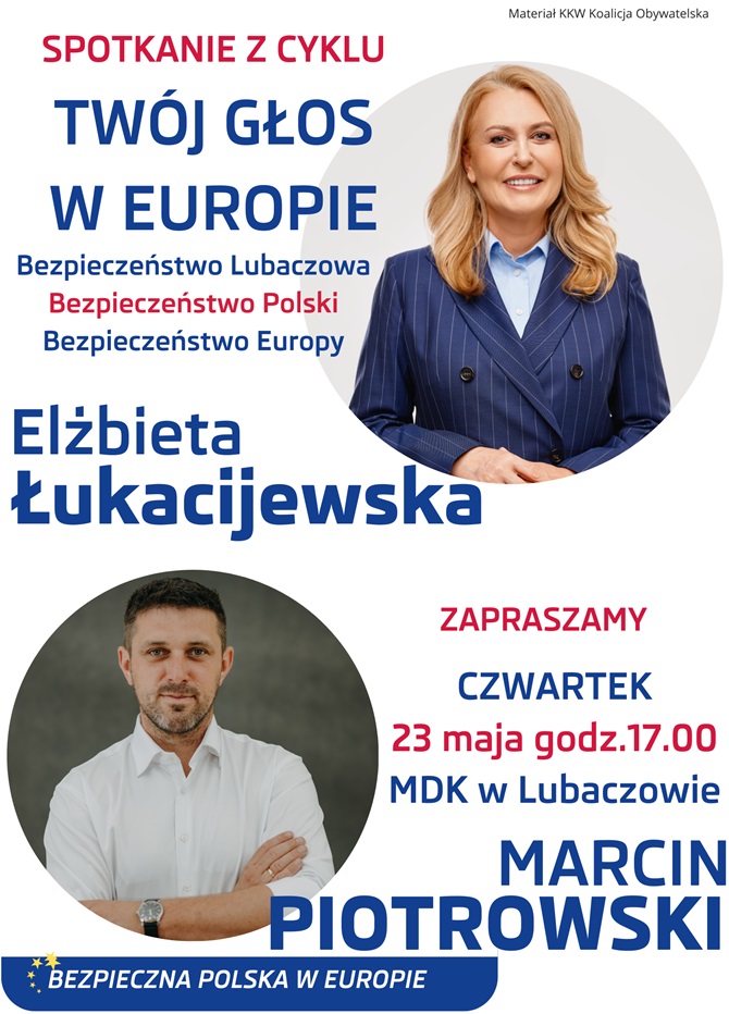 W najbliższy czwartek (23.05) w Miejskim Domu Kultury w Lubaczowie odbędzie się spotkanie z europosłanką Elżbietą Łukacijewską oraz kandydatem do PE Marcinem Piotrowskim. Tematem spotkania będą kwestie bezpieczeństwa w Europie, Polsce i w Lubaczowie.
