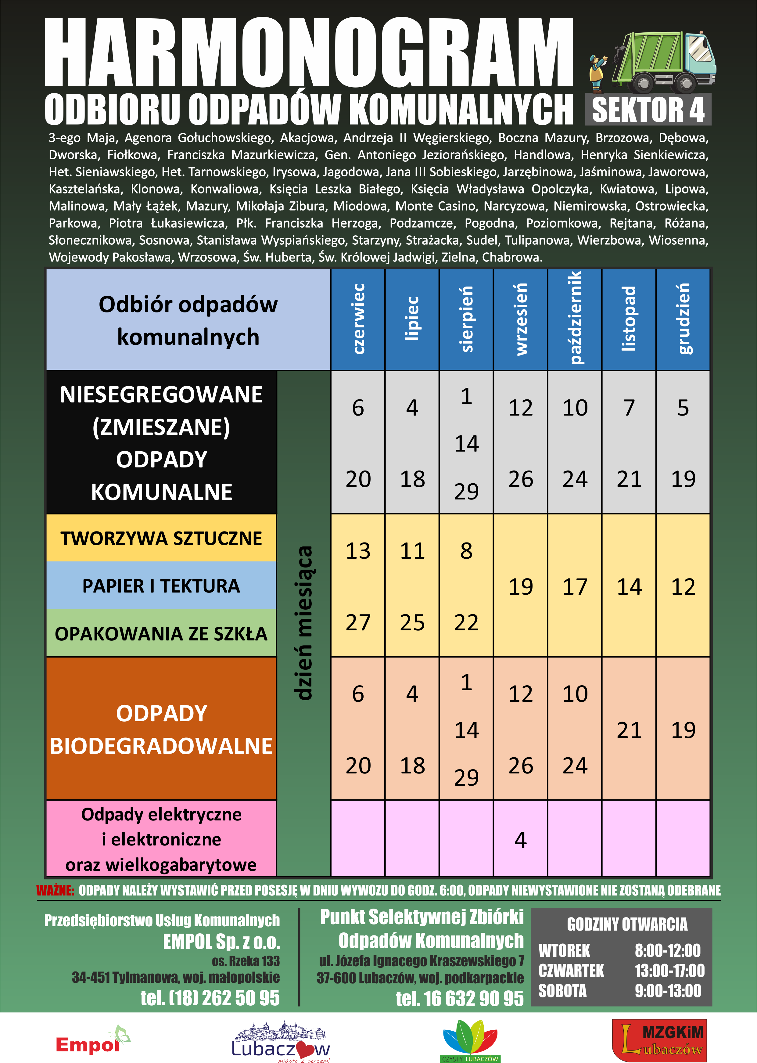 Odbiorem odpadów komunalnych z nieruchomości zamieszkałych na terenie Gminy Miejskiej Lubaczów zajmuje się Przedsiębiorstwo Usług Komunalnych EMPOL Sp. z o.o. Firma odbiera odpady komunalne z terenu Lubaczowa nieprzerwalnie od 1 marca 2021 roku.
