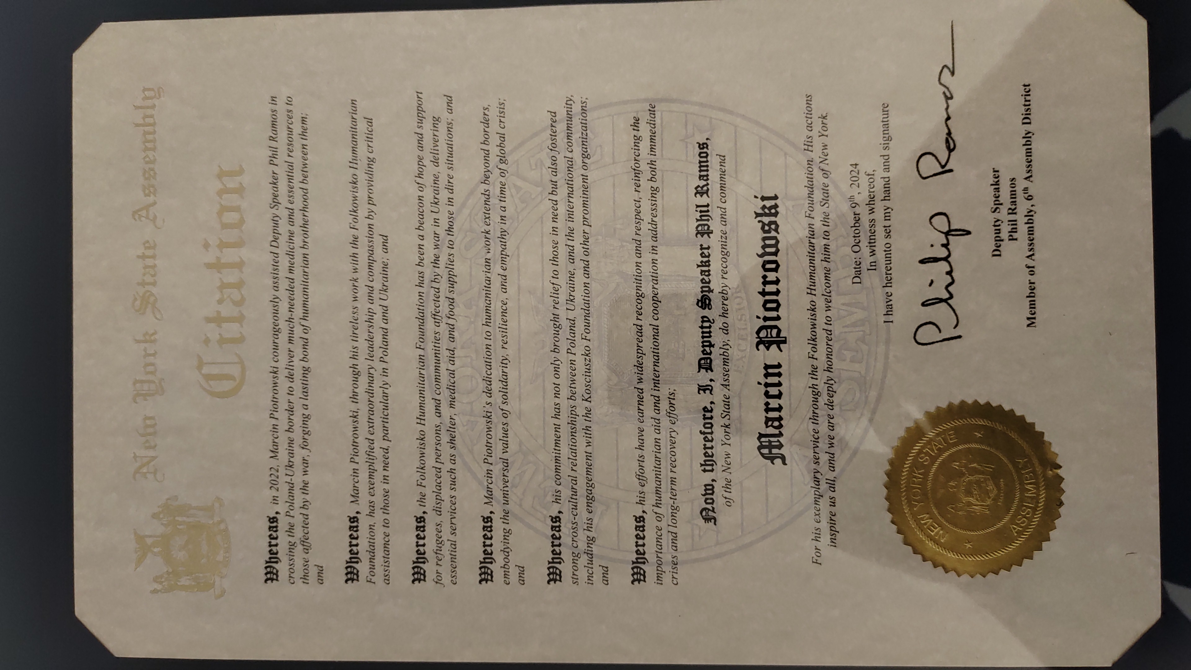 Marcin Piotrowski, lider Fundacji Humanitarnej Folkowisko, otrzymał wyjątkowe wyróżnienie od Zgromadzenia Stanu Nowy Jork. Podczas uroczystej ceremonii w siedzibie Fundacji Kościuszkowskiej w Nowym Jorku, wicemarszałek Phil Ramos wręczył mu nagrodę w uznaniu za jego zaangażowanie w rozwój współpracy międzynarodowej oraz niesienie pomocy humanitarnej. Wpisano również jego imię oraz zasługi Folkowiska do specjalnej księgi osób zasłużonych dla Stanu Nowy Jork.