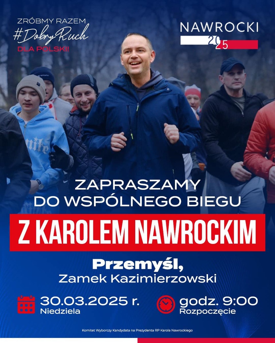 W najbliższą niedzielę, 30 marca, o godzinie 9:00 pod Zamkiem Kazimierzowskim w Przemyślu rozpocznie się wyjątkowe wydarzenie sportowe z udziałem Karola Nawrockiego, jednego z kandydatów na prezydenta RP. W ramach akcji #DobryRuch zaplanowano wspólne bieganie, które połączy aktywność fizyczną z okazją do bezpośredniego spotkania z politykiem.