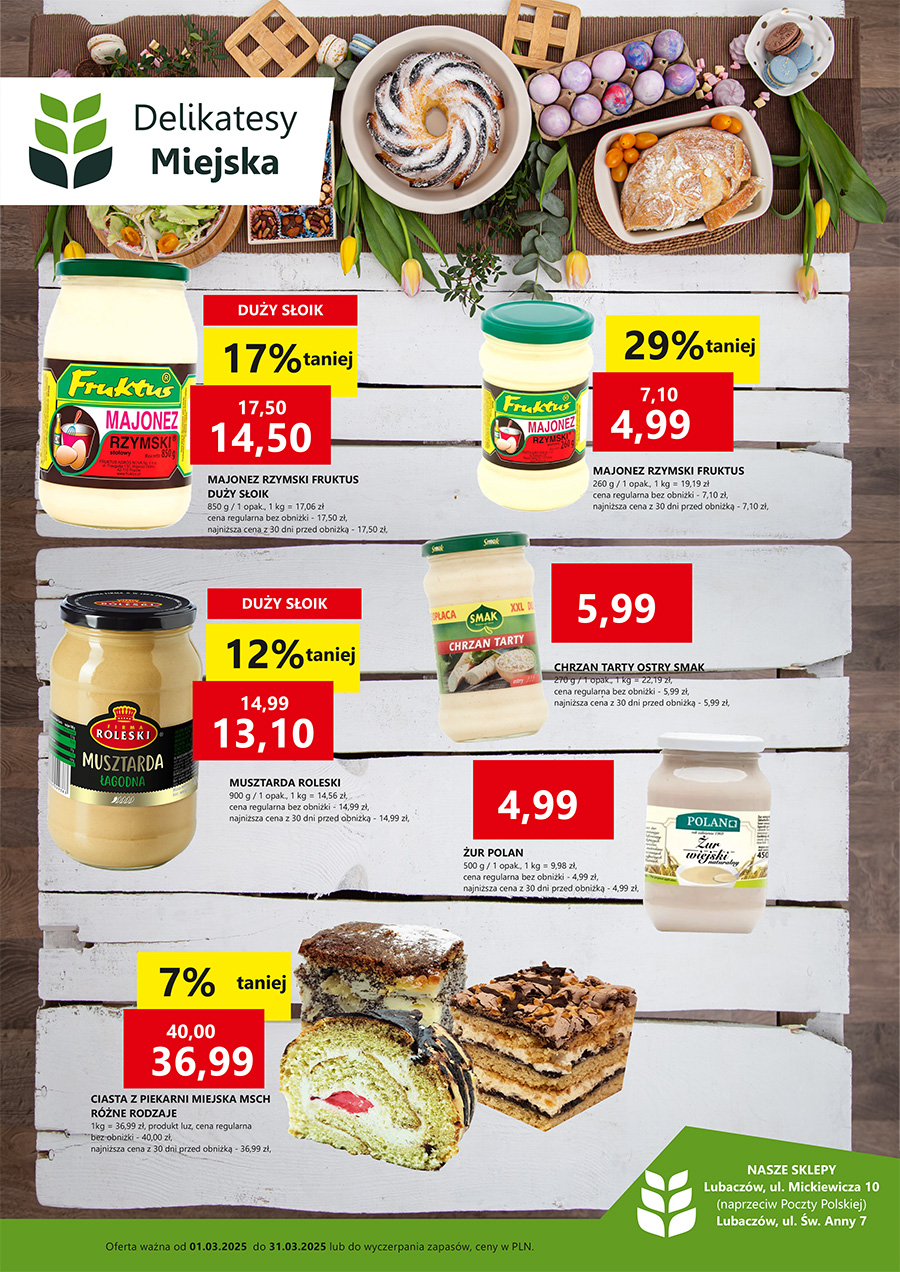 Delikatesy Miejska w Lubaczowie przygotowały atrakcyjną ofertę na święta wielkanocne. W obu sklepach – przy ul. Mickiewicza 10 i ul. Św. Anny 7 – można znaleźć wiele produktów w obniżonych cenach, w tym klasyczne składniki do świątecznych potraw.