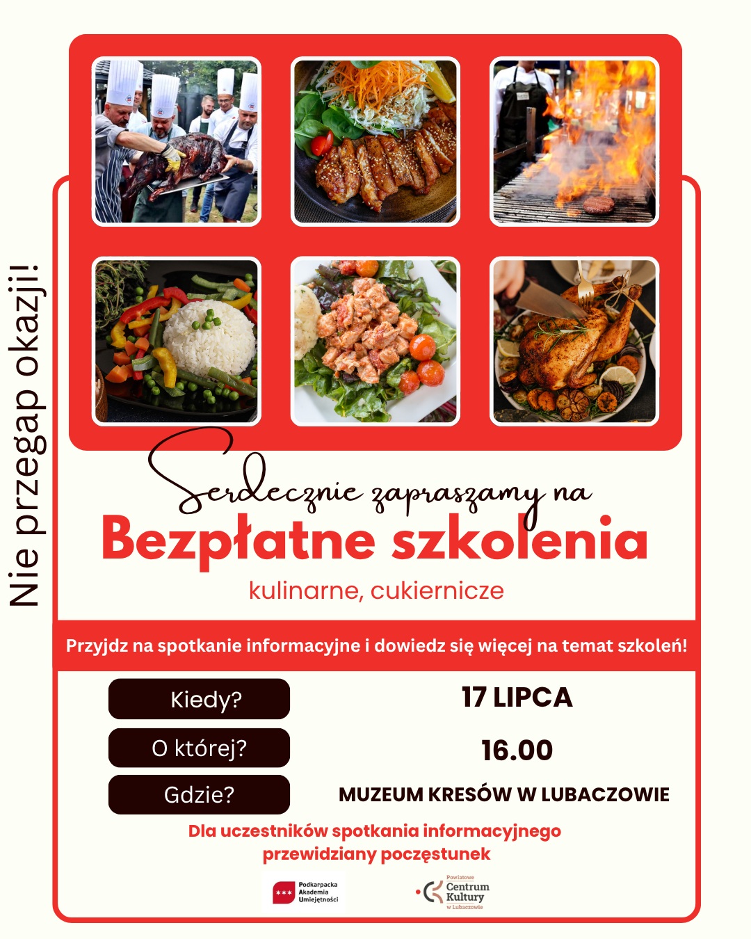 Podkarpacka Akademia Umiejętności we współpracy z Powiatowym Centrum Kultury w Lubaczowie zaprasza mieszkańców powiatu na wyjątkową kulinarną przygodę. Już 17 lipca w Muzeum Kresów odbędzie się spotkanie informacyjne dotyczące bezpłatnych szkoleń kulinarnych i cukierniczych, które skierowane są do osób pełnoletnich, nieprowadzących działalności gospodarczej.