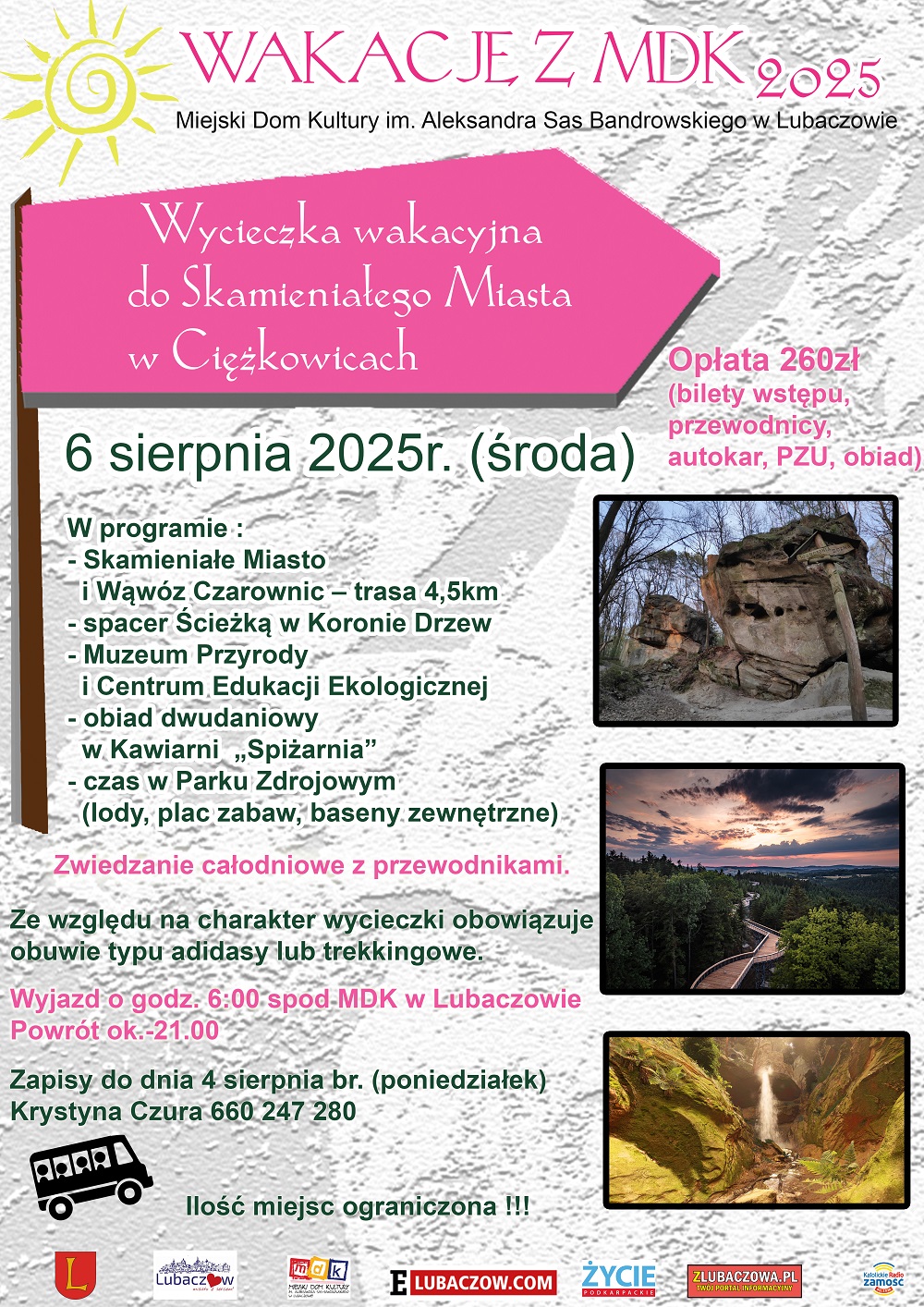 Wyjazd zaplanowano na godzinę 6:00 spod budynku MDK w Lubaczowie, powrót ok. 21:00. Zapisy prowadzone są do 4 sierpnia – liczba miejsc ograniczona. Kontakt: Krystyna Czura, tel. 660 247 280.