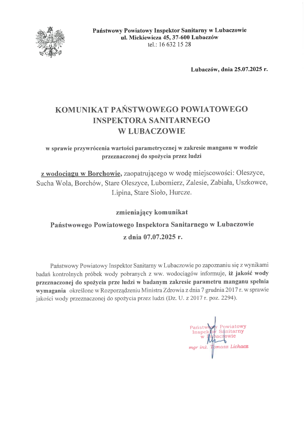 Wodociąg w Borchowie zaopatruje w wodę mieszkańców miejscowości: Oleszyce, Sucha Wola, Borchów, Stare Oleszyce, Lubomierz, Zalesie, Zabiała, Uszkowce, Lipina, Stare Sioło i Hurcze. Wcześniejsze badania wskazywały na przekroczenie dopuszczalnej wartości manganu, co mogło powodować pogorszenie smaku, barwy oraz osad w wodzie. Choć nie stanowiło to zagrożenia dla zdrowia, mieszkańcy mogli odczuwać dyskomfort w codziennym użytkowaniu wody.