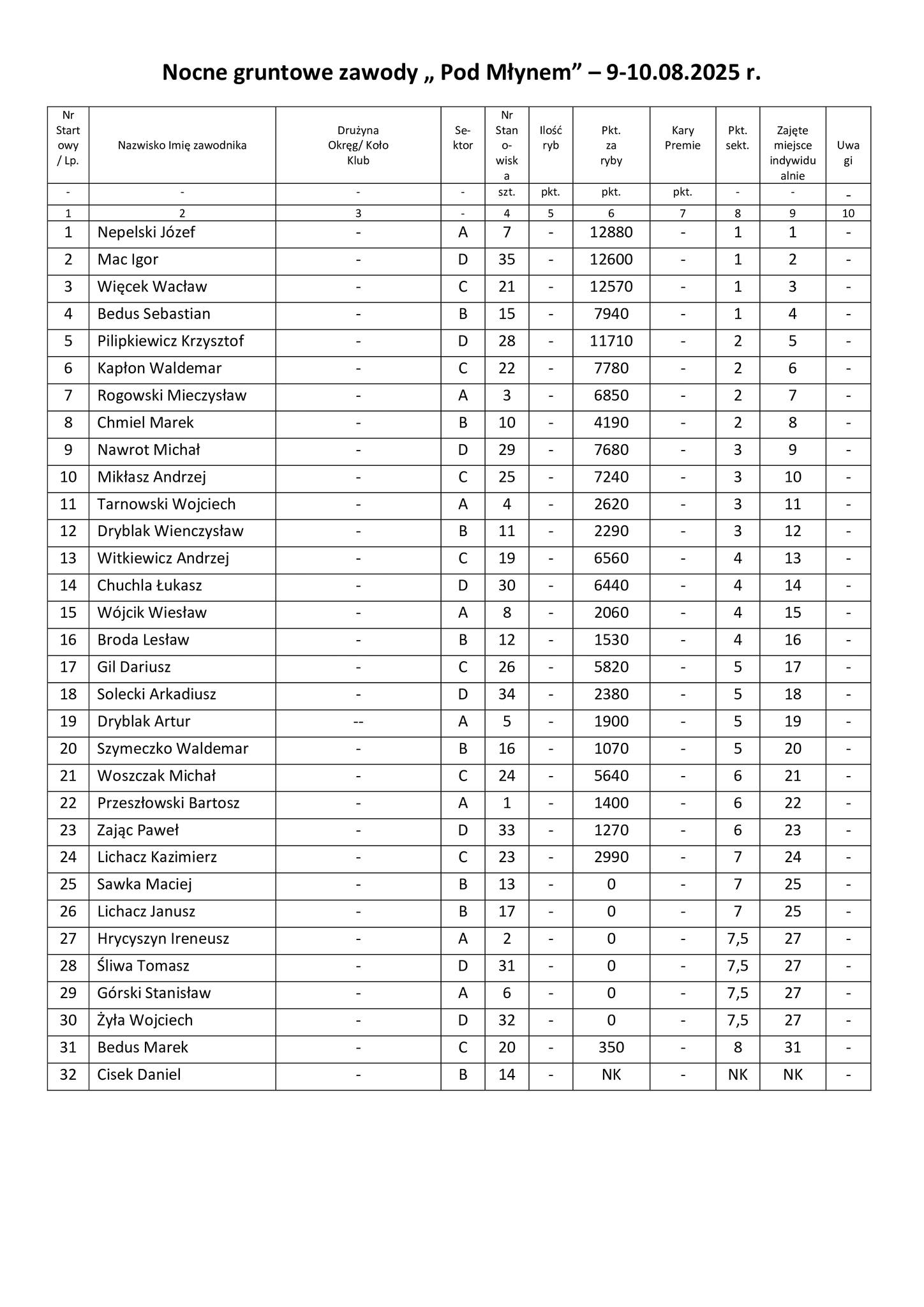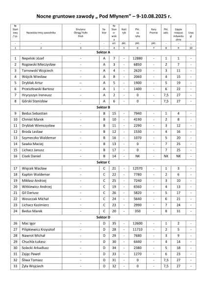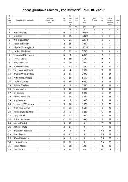 W nocy z 9 na 10 sierpnia 2025 roku na łowisku „Pod Młynem” w Lubaczowie odbyły się gruntowe zawody wędkarskie z cyklu „Złów i wypuść”. Do rywalizacji stanęło 32 wędkarzy z okręgu, a zmagania toczyły się w czterech sektorach, na żywej rybie.