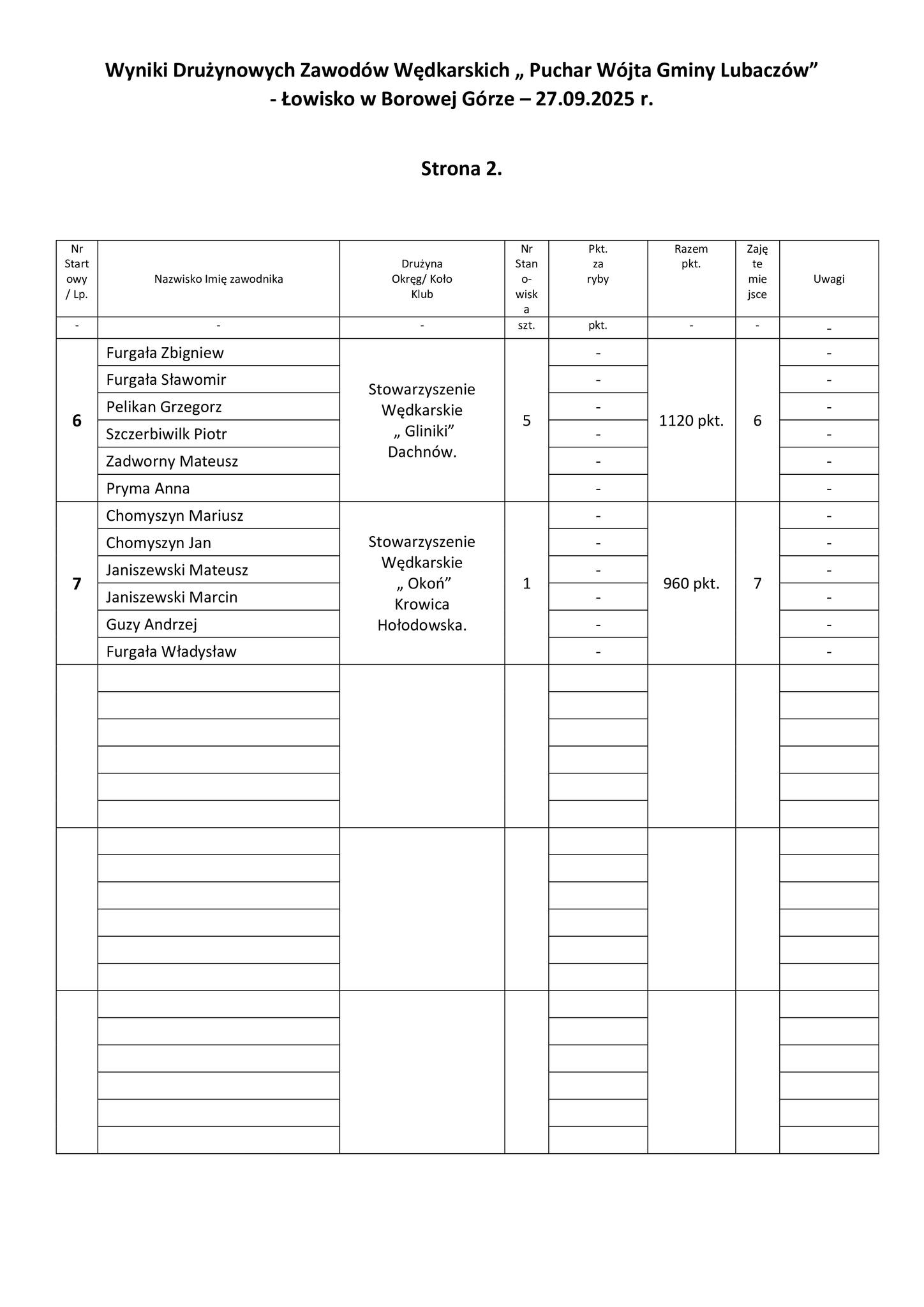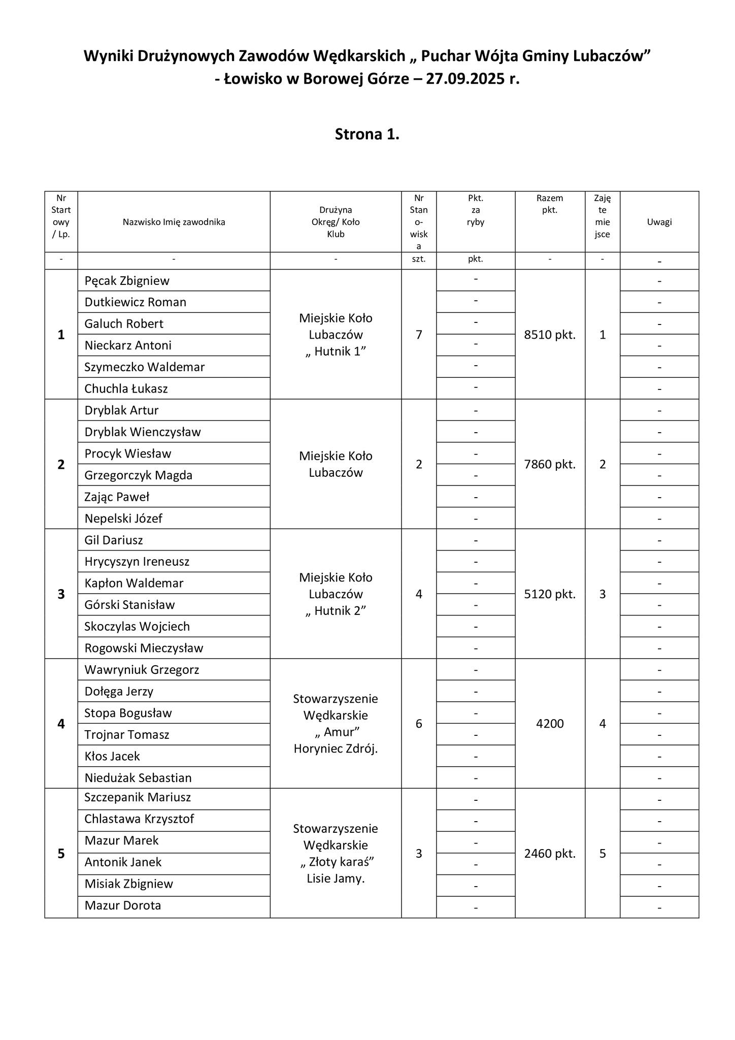 W sobotę, 27 września, na łowisku w Borowej Górze odbyły się I Drużynowe Zawody Stowarzyszeń i Kół Wędkarskich o Puchar Wójta Gminy Lubaczów. Do rywalizacji przystąpiło siedem drużyn, a w sumie 42 zawodników.