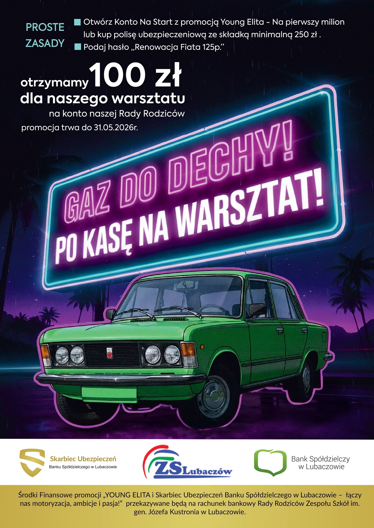 Pomysł łączy pasję do motoryzacji z realnym wsparciem edukacji technicznej. W prosty sposób każdy może pomóc uczniom rozbudować warsztat, w którym powstają kolejne projekty młodych mechaników – w tym głośna renowacja kultowego Fiata 125p.