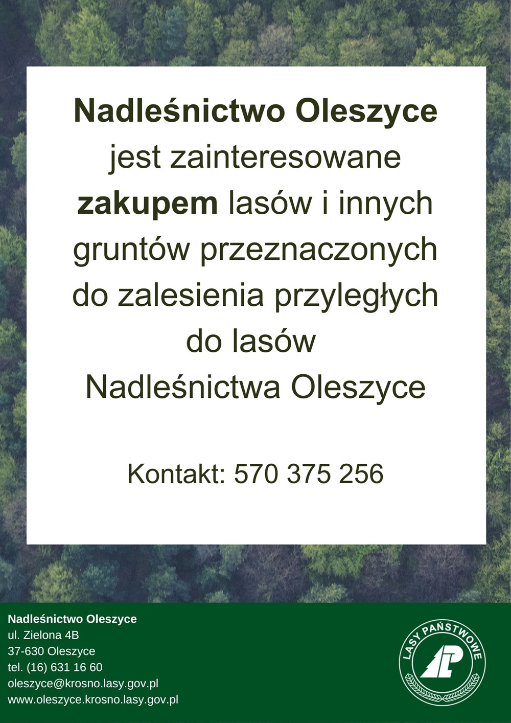 Nadleśnictwo Oleszyce jest zainteresowane zakupem lasów i gruntów pod zalesienie, zwłaszcza tych przylegających do terenów Lasów Państwowych lub mających odpowiednią powierzchnię i dostęp do dróg publicznych.