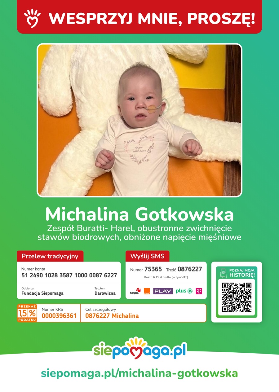 Każda złotówka, każde udostępnienie zbiórki, każde słowo wsparcia ma ogromne znaczenie. To realna pomoc w codziennej walce o zdrowie Michaliny i szansa na to, by mogła cieszyć się większą samodzielnością w przyszłości.