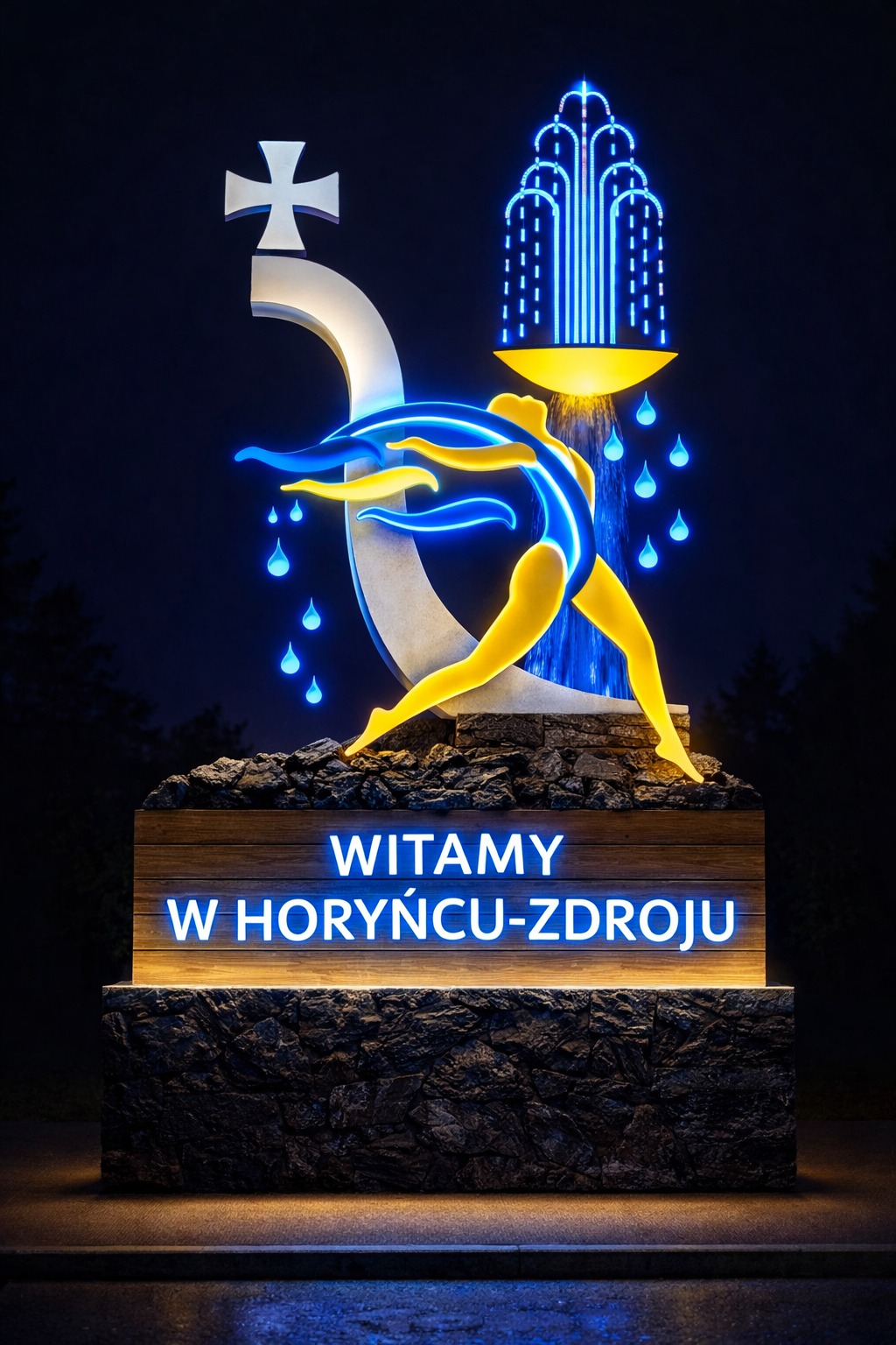 futuristic town entrance monument, glowing neon water sculpture forming a human figure, dynamic running pose, blue and yellow light, stylized fountain with water drops, number 5 with cross symbol integrated, dark background, cinematic lighting, ultra detailed, 3D render, octane render, high contrast, surreal, artstation style, 8k