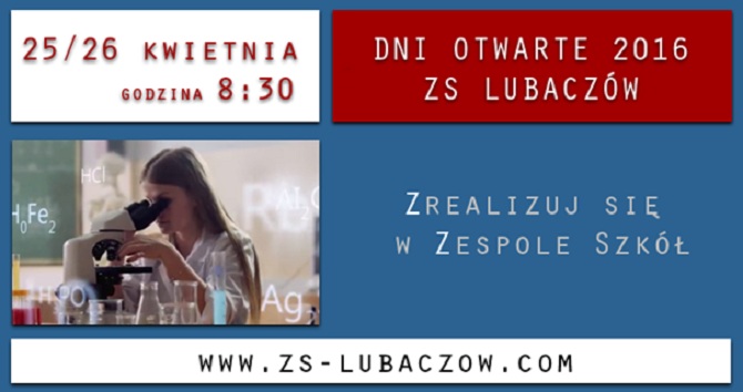 Zespół Szkół im. gen. Józefa Kustronia w Lubaczowie serdecznie zaprasza wszystkich Gimnazjalistów z naszego powiatu i nie tylko na Dni Otwarte, które odbędą się 25 i 26 kwietnia.