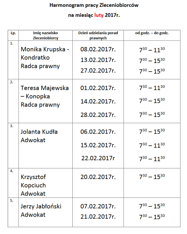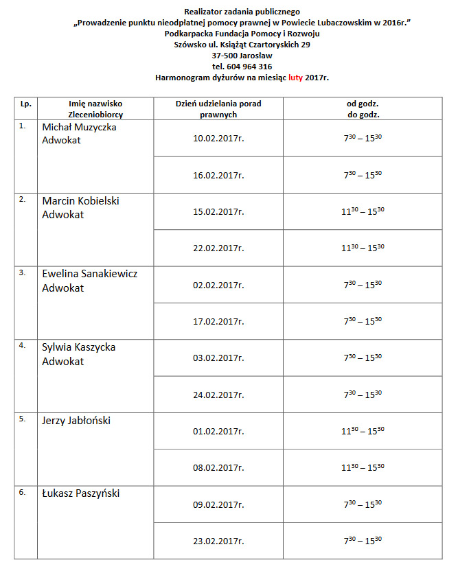 Powiat Lubaczowski ogłosił harmonogram udzielania bezpłatnych porad prawnych w Lubaczowie. Zgodnie z ustawą z darmowych porad będą mogły skorzystać osoby do 26 roku życia, seniorzy powyżej 65 roku życia, kombatanci i weterani, osoby posiadające Kartę Dużej Rodziny, osoby które znalazły się w sytuacji zagrożenia lub poniosły starty w wyniku klęski żywiołowej, katastrofy naturalnej lub awarii technicznej.
