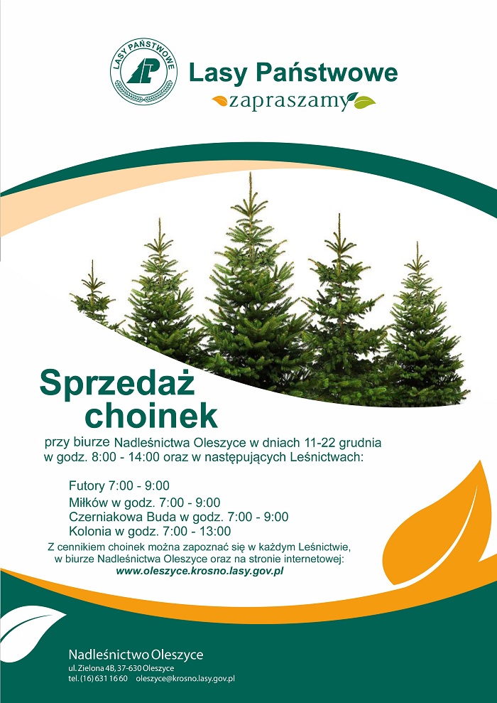 Właśnie taką ofertę przygotowało w tym roku Nadleśnictwo Oleszyce. Sprzedaż świątecznych choinek będzie prowadzona od 11 do 22 grudnia w biurze Nadleśnictwa oraz w leśniczówkach Futory, Miłków, Czerniakowa Buda (7:00 - 9:00) oraz Kolonia (7:00 - 13:00)