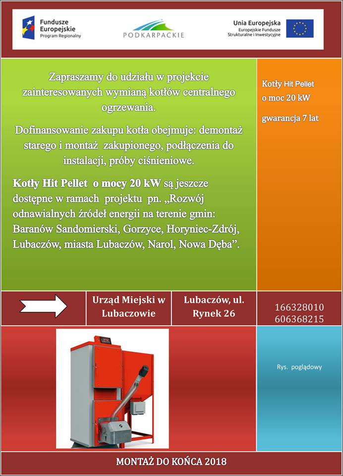Dostępne są kotły Hit Pellet o mocy 20 kW na paliwo stałe – pellet drzewny. Dofinansowanie zakupu obejmuje: demontaż starego i montaż zakupionego, podłączenia do instalacji, próby ciśnieniowe. Montaż urządzeń zrealizowany będzie do końca 2018 roku.