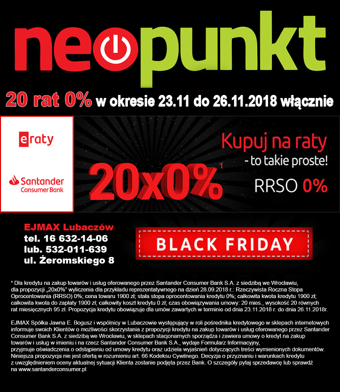 Od piątku (23.11) do poniedziałku (26.11) w sklepie NEOPUNKT - Lubaczów, ul. Żeromskiego 8 obowiązywała będzie promocja "20 rat 0% na cały asortyment towarów: RTV, AGD, komputery, laptopy, telefony i drukarki!