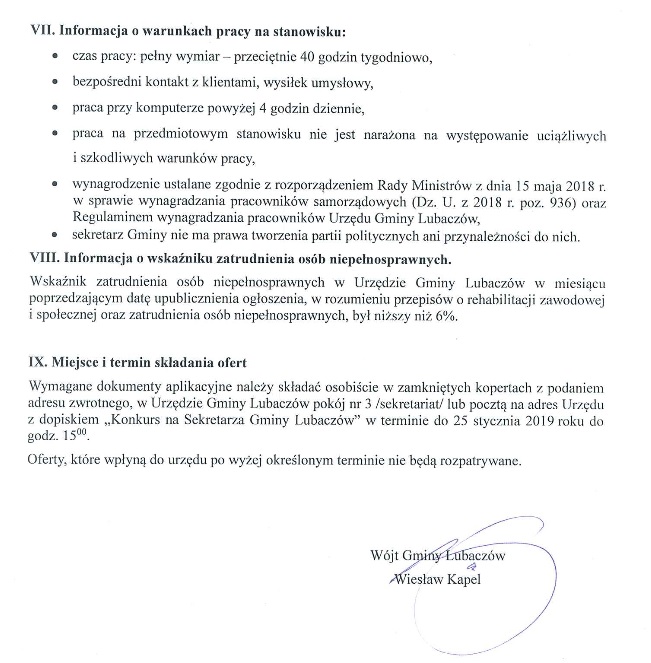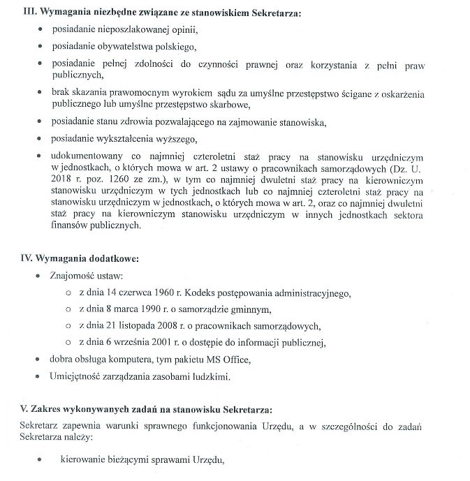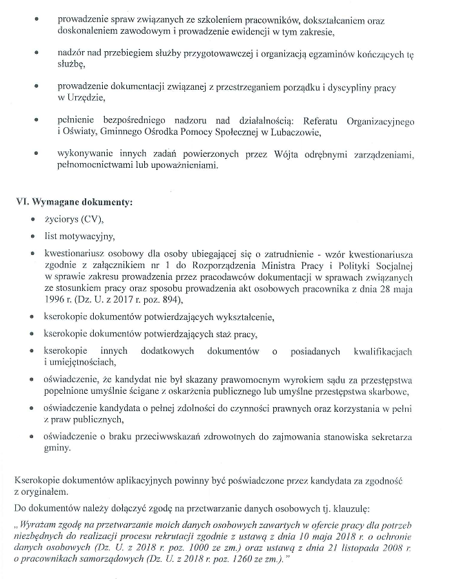 Wójt gminy Lubaczów ogłasza nabór na wolne kierownicze stanowisko urzędnicze sekretarza gminy. Od kandydatów wymaga wyższego wykształcenia, obywatelstwa polskiego, co najmniej czteroletniego stażu pracy na stanowisku urzędniczym, pełną zdolność do czynności prawnych, niekaralność oraz znajomość regulacji prawnych w zakresie struktur i funkcjonowania administracji samorządowej.