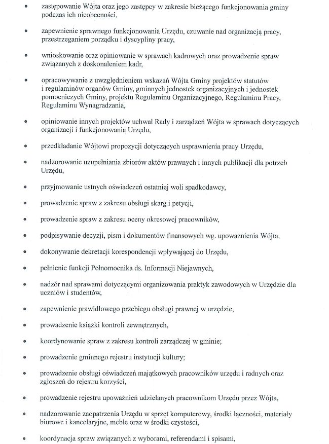Do najważniejszych zadań sekretarza należy przede wszystkim kierowanie bieżącymi sprawami Urzędu. Osoba na tym stanowisku zastępuje wójta oraz jego zastępcy w zakresie bieżącego funkcjonowania gminy podczas ich nieobecności. Sekretarz musi również zapewnić sprawne funkcjonowanie Urzędu. Poniżej dokładny zakres obowiązków: