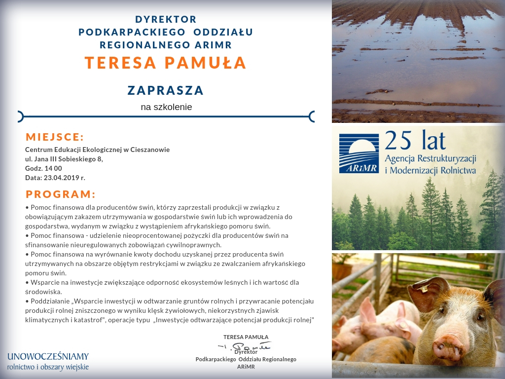 Dyrektor Podkarpackiego Oddziału Regionalnego ARIMR Teresa Pamuła zaprasza na szkolenie dla rolników, które odbędzie się w Cieszanowie. Początek o godzinie 14:00.