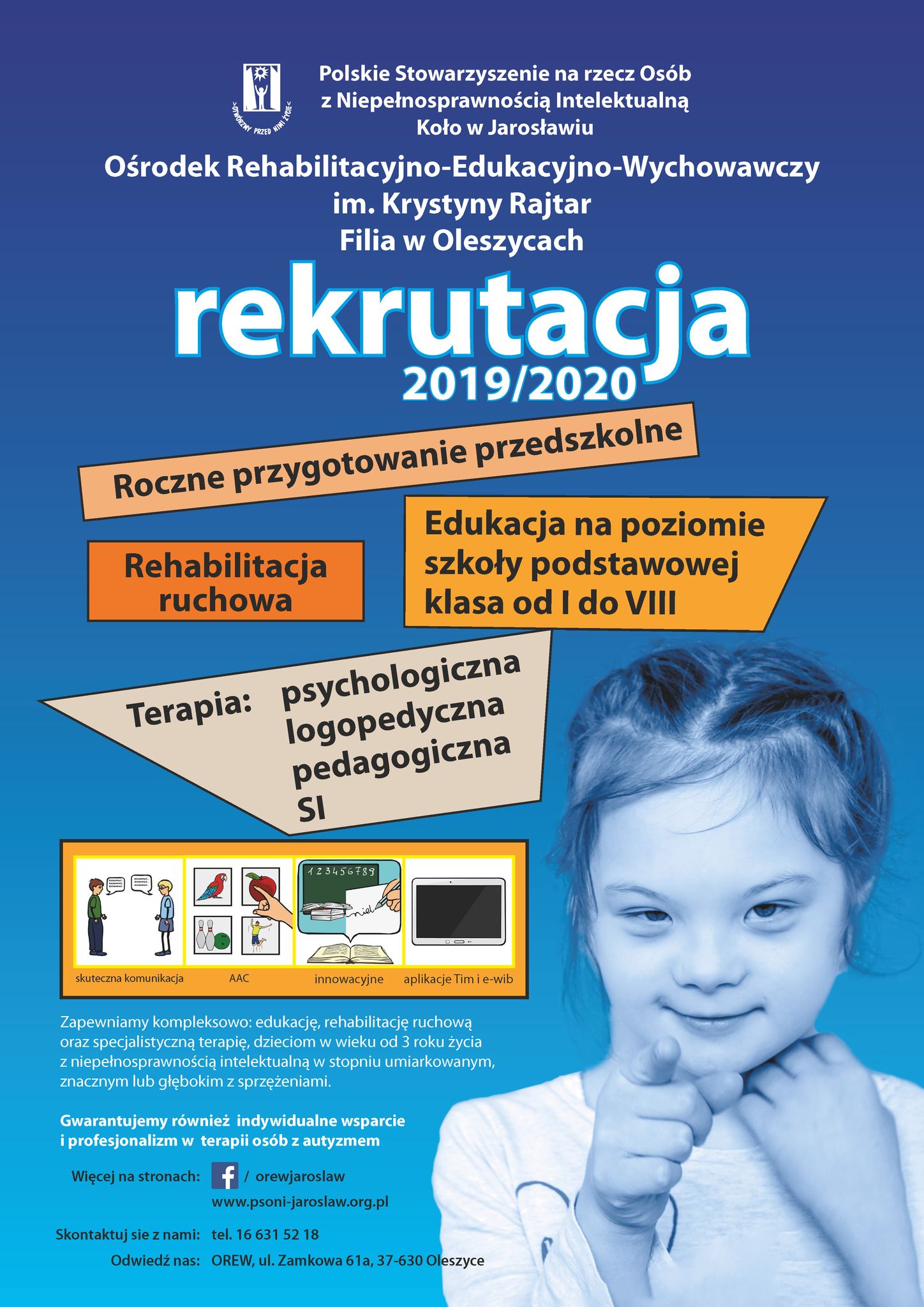 Ośrodek Rehabilitacyjno –Edukacyjno – Wychowawczy im. Krystyna Rajtar- filia w Oleszycach, Polskiego Stowarzyszenia na rzecz Osób z Niepełnosprawnością Intelektualną Koło w Jarosławiu, ogłasza nabór uczniów na rok szkolny 2019/2020.