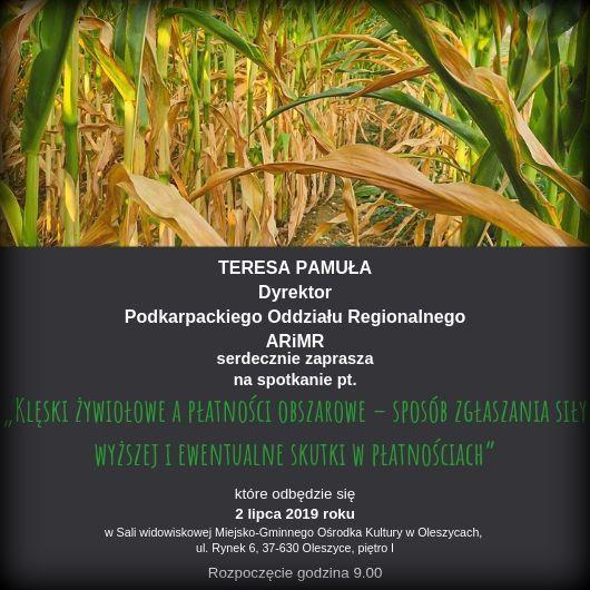 Dyrektor Podkarpackiego Oddziału Regionalnego ARiMR Teresa Pamuła zaprasza na spotkanie pt. "Klęski żywiołowe a płatności obszarowe - sposób zgłaszania siły wyższej i ewentualne skutki w płatnościach". Spotkanie odbędzie się 2 lipca 2019 r. o godz. 9:00 w sali widowiskowej Miejsko-Gminnego Ośrodka Kultury w Oleszycach.