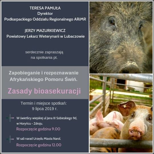 Dyrektor Podkarpackiego Oddziału Regionalnego ARiMR Teresa Pamuła oraz Powiatowy Lekarz Weterynarii w Lubaczowie Jerzy Mazurkiewicz zapraszają hodowców na spotkanie dotyczące zapobiegania i rozpoznawania Afrykańskiego Pomoru Świń.