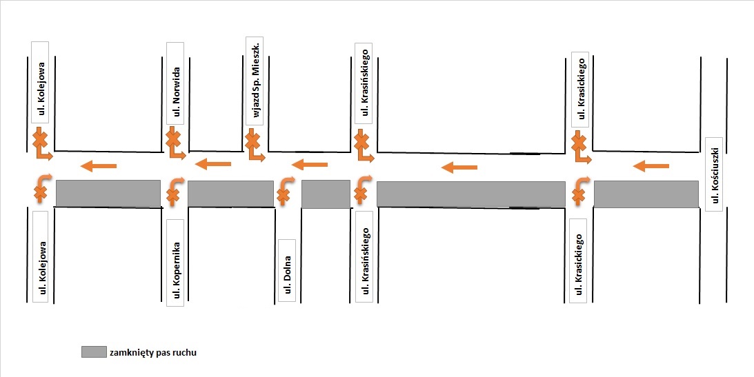 Ruch będzie odbywał się jednokierunkowo, od wjazdu z ul. Kościuszki aż do wyjazdu na ul. Kolejową. Wyjazd z ul. Krasickiego, Krasińskiego, Dolnej i Kopernika na ul. Słowackiego będzie możliwy w kierunku ul. Kolejowej lub na wprost. - informują miejscy urzędnicy