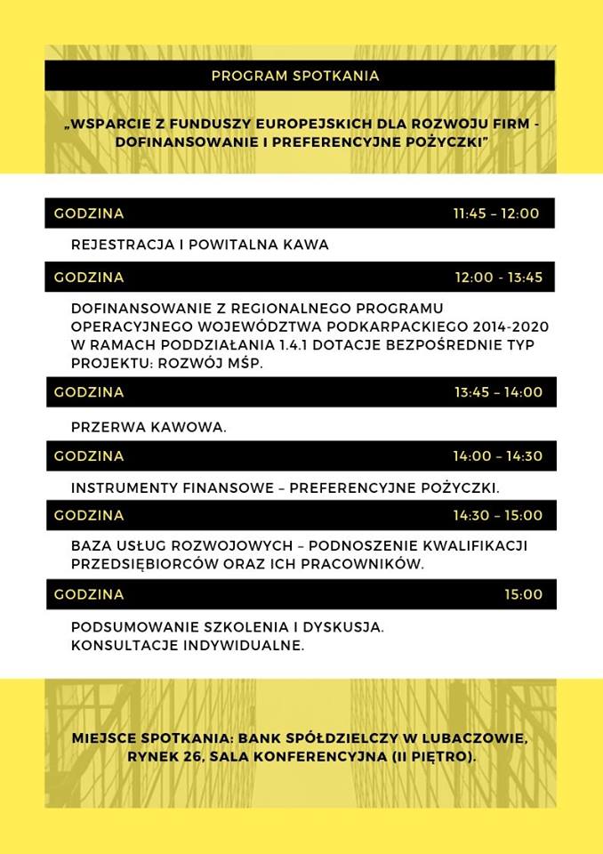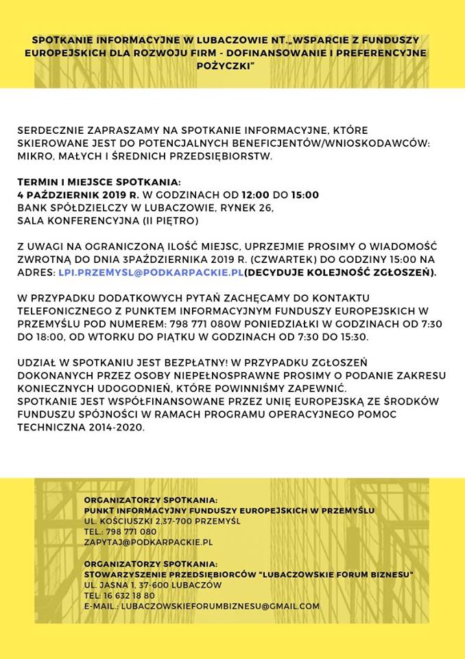 Główny Punkt Informacyjny Funduszy Europejskich w Przemyślu we współpracy ze Stowarzyszeniem Przedsiębiorców Lubaczowskie Forum Biznesu zapraszają przedsiębiorców z terenu powiatu lubaczowskiego na spotkanie informacyjne dotyczące aktualnych możliwości pozyskania środków na rozwój mikro, małych i średnich przedsiębiorstw.