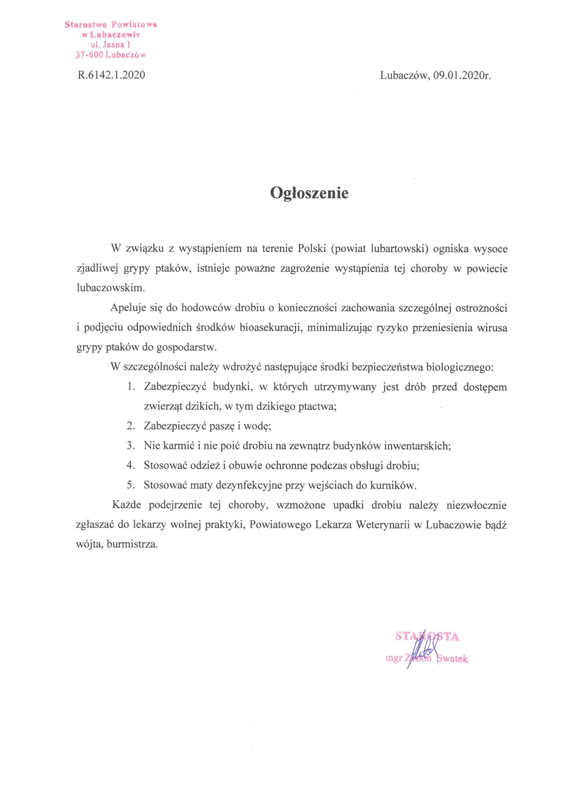 W związku z pojawieniem się na Lubelszczyźnie ptasiej grypy, starosta lubaczowski Zenon Swatek zaapelował do hodowców drobiu o przestrzeganie szczególnych zasad ostrożności.