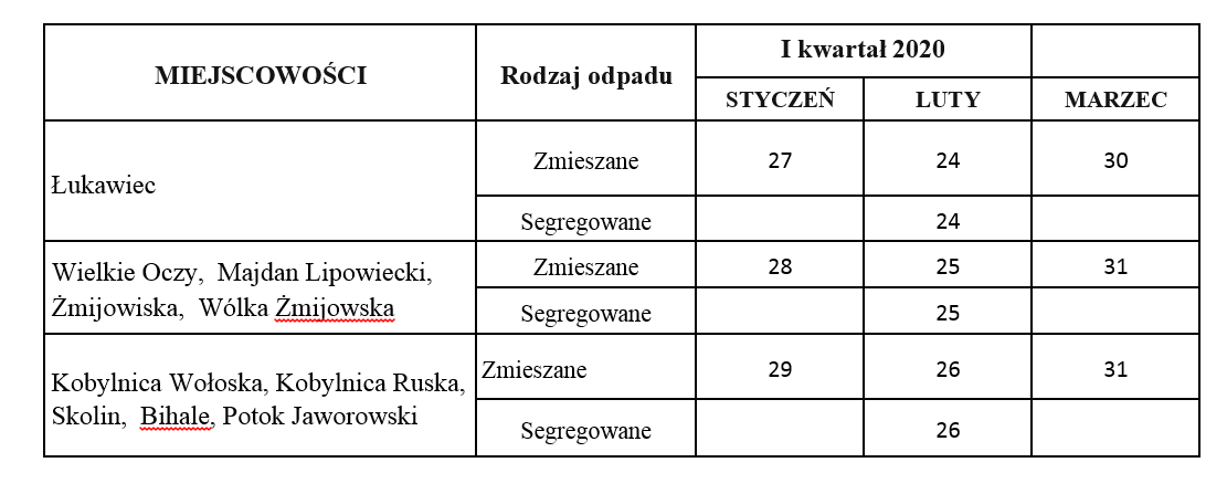 Harmonogram odbioru odpadów z gminy Wielkie Oczy – I kwartał 2020