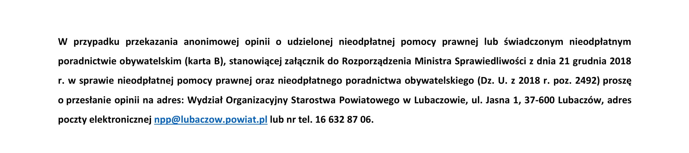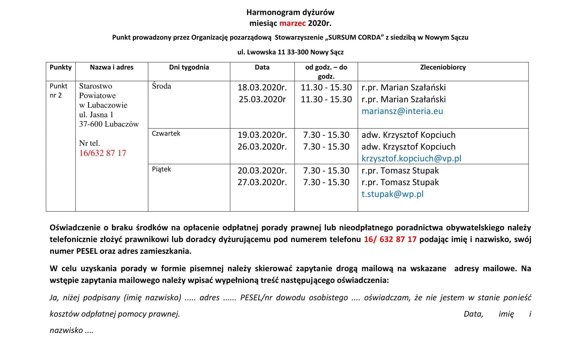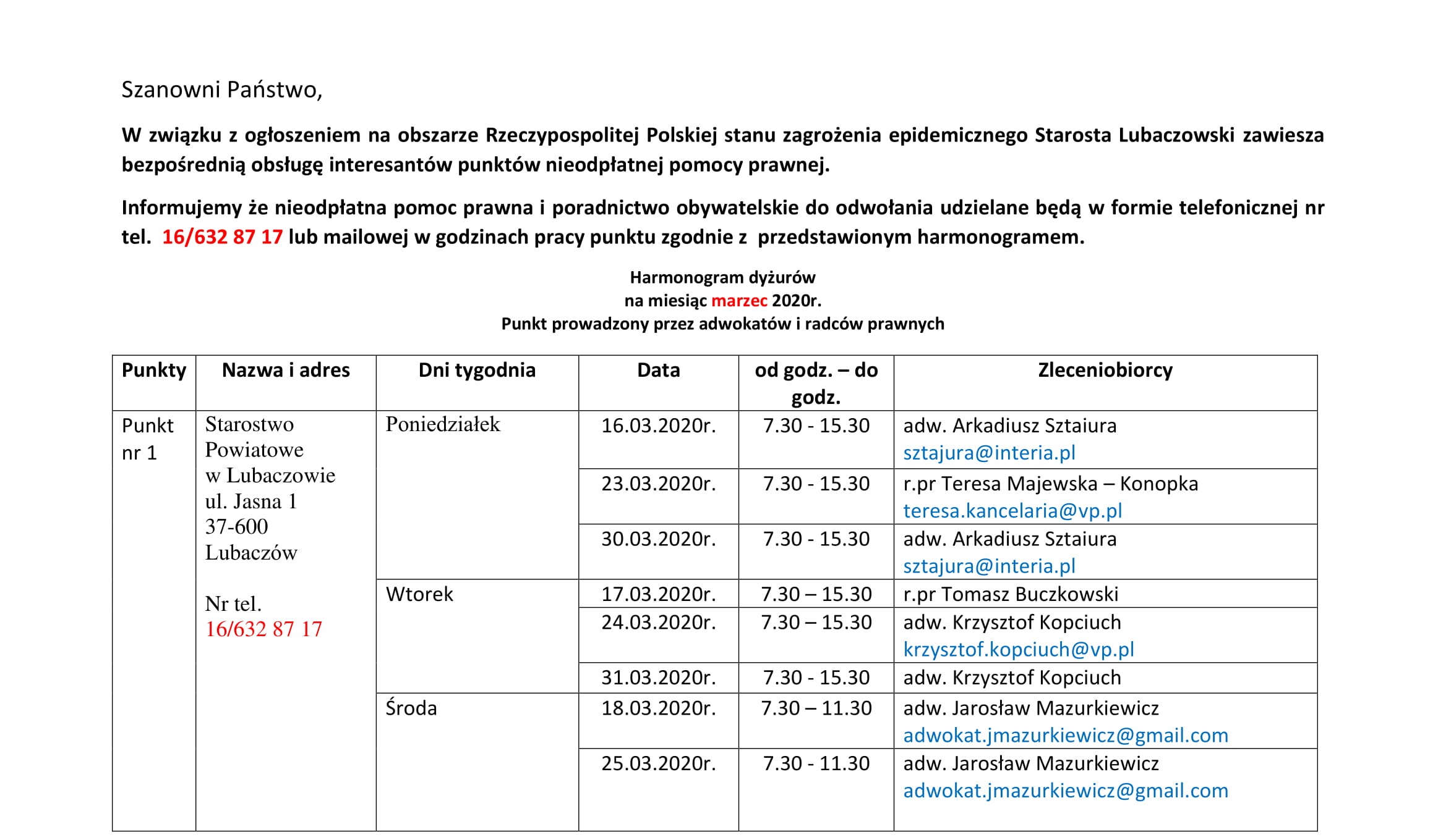 W związku z ogłoszeniem na obszarze Rzeczypospolitej Polskiej stanu zagrożenia epidemicznego Starosta Lubaczowski zawiesza bezpośrednią obsługę interesantów punktów nieodpłatnej pomocy prawnej.