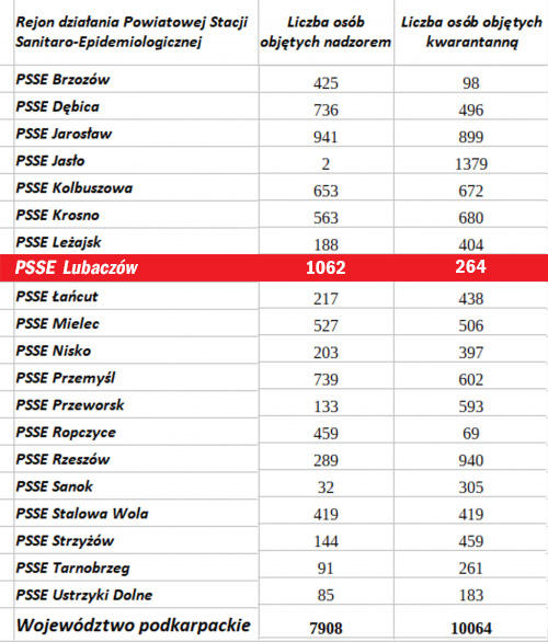 Mamy najnowsze dane Wojewódzkiej Stacji Sanitarno-Epidemiologicznej w Rzeszowie dotyczące koronawirusa w poszczególnych powiatach. Wynika z nich, że w naszym powiecie spadła liczba osób (o 57) objętych nadzorem epidemiologicznym. W odniesieniu do dnia wczorajszego ilość osób poddanych kwarantannie domowej się nie zmieniła.