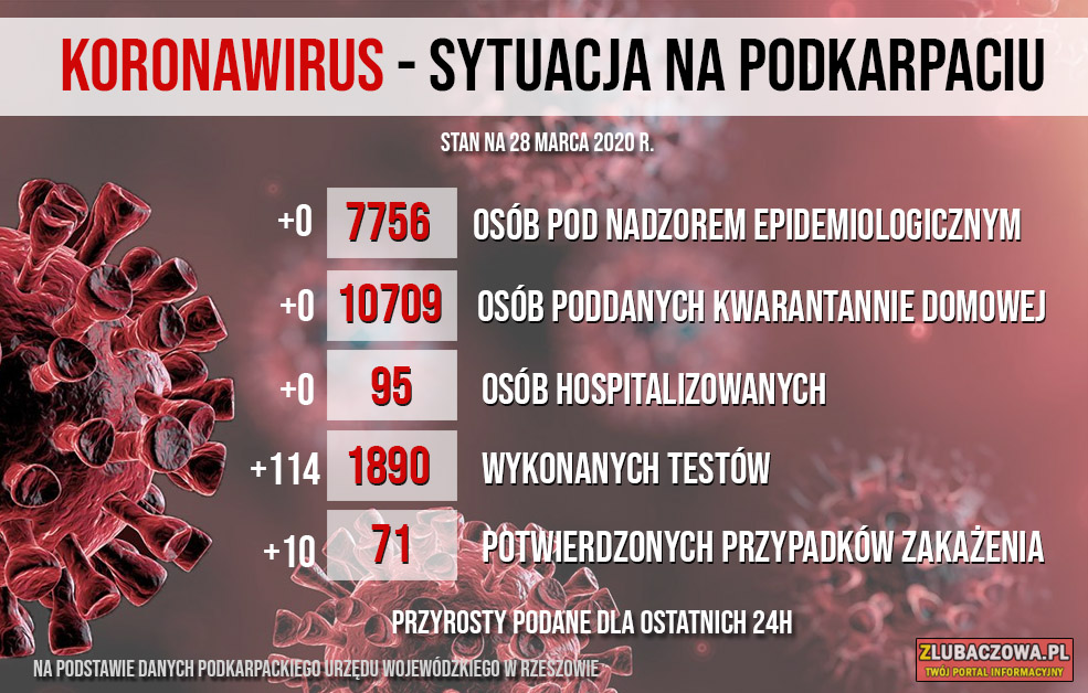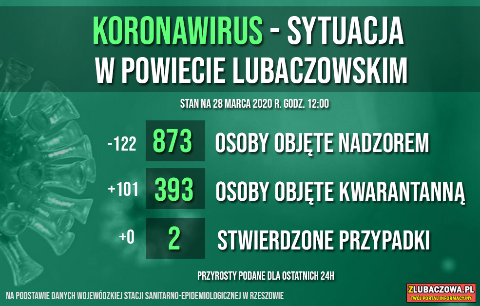 Według danych Wojewódzkiej Stacji Sanitarno-Epidemiologicznej w Rzeszowie na dzień dzisiejszy (28.03) 873 osób objętych jest nadzorem epidemiologicznym (spadek o 122) natomiast 393 jest poddanych kwarantannie domowej (wzrost o 101). Do tej pory stwierdzono 2 przypadki zakażenia - u młodej kobiety z gminy Stary Dzików oraz mężczyzny w średnim w wieku z gminy Wielkie Oczy.