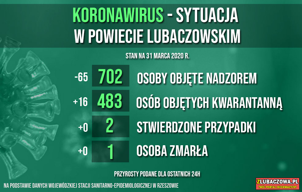 Według danych Wojewódzkiej Stacji Sanitarno-Epidemiologicznej w Rzeszowie na dzień dzisiejszy (31.03) 702 osoby objęte jest nadzorem epidemiologicznym (spadek o 65) natomiast 483 jest poddanych kwarantannie domowej (wzrost o 16). Do tej pory stwierdzono 2 przypadki zakażenia - u młodej kobiety z gminy Stary Dzików oraz mężczyzny w średnim w wieku z gminy Wielkie Oczy. Niestety zakażona 32-letnia kobieta z gminy Stary Dzików zmarła w poniedziałek w szpitalu w Łańcucie.