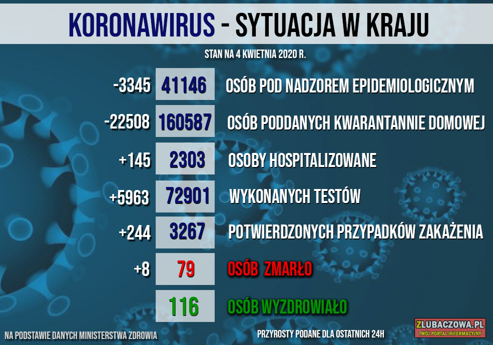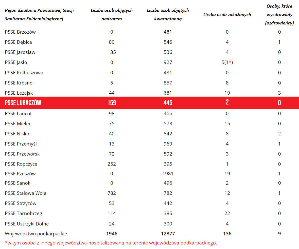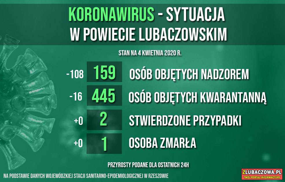 Według danych Wojewódzkiej Stacji Sanitarno-Epidemiologicznej w Rzeszowie na dzień dzisiejszy (04.04) 159 osób objętych jest nadzorem epidemiologicznym (spadek o 108) natomiast 445 jest poddanych kwarantannie domowej (spadek o 16). Do tej pory stwierdzono 2 przypadki zakażenia - u młodej kobiety z gminy Stary Dzików oraz mężczyzny w średnim w wieku z gminy Wielkie Oczy. Niestety zakażona 32-letnia kobieta z gminy Stary Dzików zmarła w poniedziałek w szpitalu w Łańcucie.