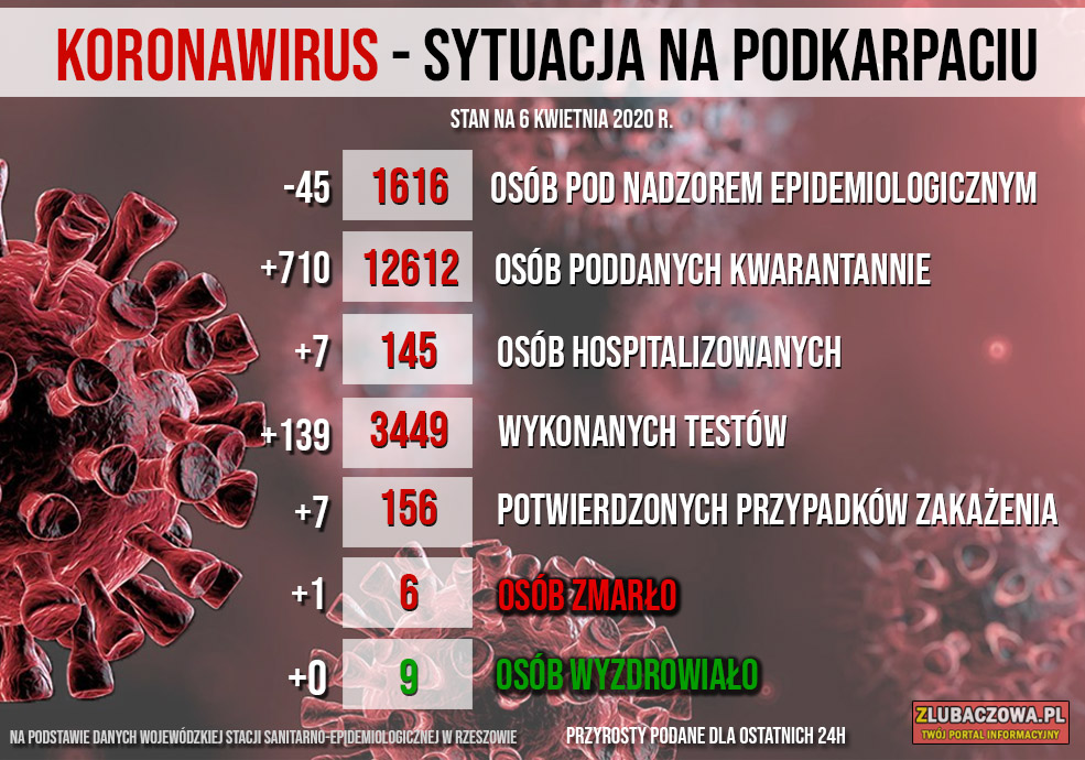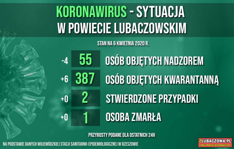 Według danych Wojewódzkiej Stacji Sanitarno-Epidemiologicznej w Rzeszowie na dzień dzisiejszy (06.04) 55 osób objętych jest nadzorem epidemiologicznym (spadek o 4) natomiast 387 jest poddanych kwarantannie domowej (wzrost o 6). Do tej pory stwierdzono 2 przypadki zakażenia - u młodej kobiety z gminy Stary Dzików oraz mężczyzny w średnim w wieku z gminy Wielkie Oczy. Niestety zakażona 32-letnia kobieta z gminy Stary Dzików zmarła w poniedziałek w szpitalu w Łańcucie.