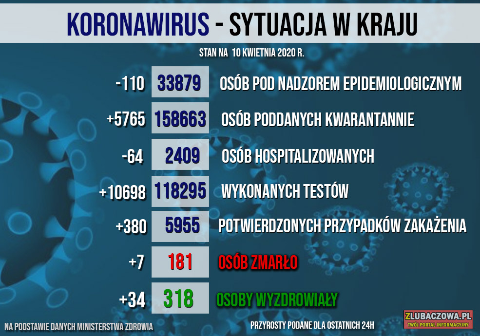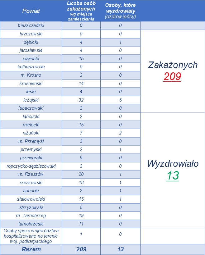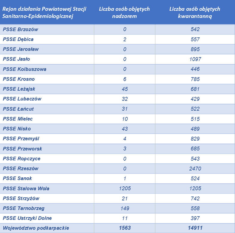 Według danych Wojewódzkiej Stacji Sanitarno-Epidemiologicznej w Rzeszowie na dzień dzisiejszy (10.04) 32 osoby objęte jest nadzorem epidemiologicznym (spadek o 2) natomiast 429 jest poddanych kwarantannie domowej (spadek o 14). Do tej pory stwierdzono 2 przypadki zakażenia - u młodej kobiety z gminy Stary Dzików oraz mężczyzny w średnim w wieku z gminy Wielkie Oczy. Niestety zakażona 32-letnia kobieta z gminy Stary Dzików zmarła 30 marca w szpitalu w Łańcucie.