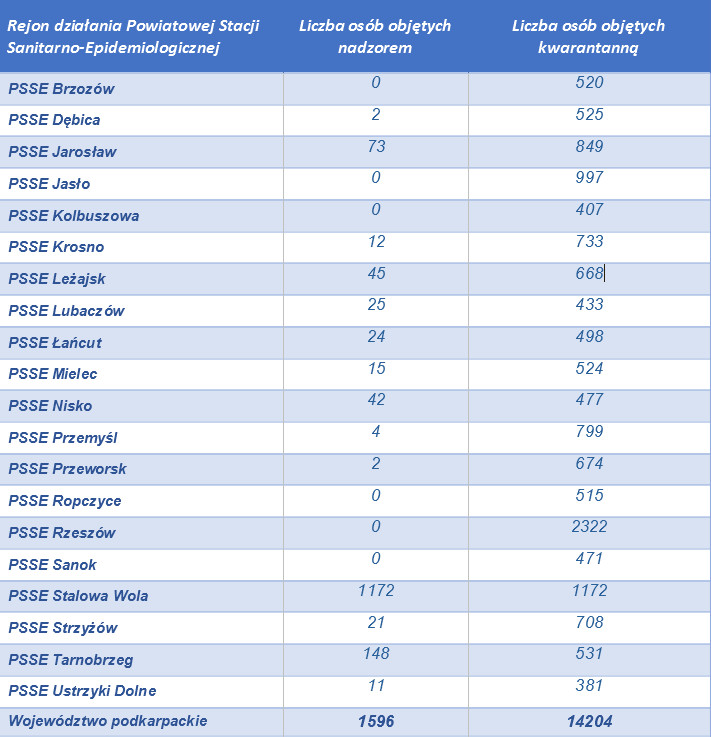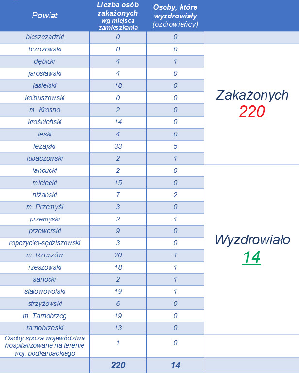 Według danych Wojewódzkiej Stacji Sanitarno-Epidemiologicznej w Rzeszowie na dzień dzisiejszy (11.04) 25 osób objętych jest nadzorem epidemiologicznym (spadek o 7) natomiast 433 jest poddanych kwarantannie domowej (wzrost o 4). Do tej pory stwierdzono 2 przypadki zakażenia - u młodej kobiety z gminy Stary Dzików oraz mężczyzny w średnim w wieku z gminy Wielkie Oczy. Niestety zakażona 32-letnia kobieta z gminy Stary Dzików zmarła 30 marca w szpitalu w Łańcucie.