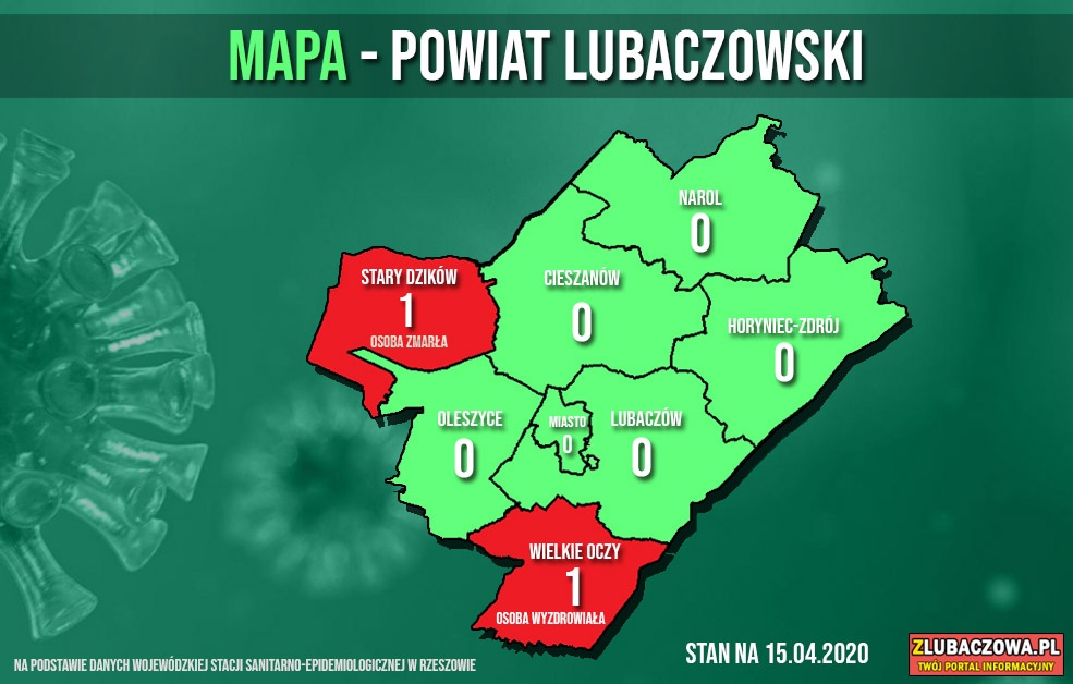 Według danych Wojewódzkiej Stacji Sanitarno-Epidemiologicznej w Rzeszowie na dzień dzisiejszy (15.04) 1 osoba objęta jest nadzorem epidemiologicznym (bez zmian) natomiast 358 jest poddanych kwarantannie domowej (spadek o 7). Do tej pory stwierdzono 2 przypadki zakażenia - u młodej kobiety z gminy Stary Dzików oraz mężczyzny w średnim w wieku z gminy Wielkie Oczy. Niestety zakażona 32-letnia kobieta z gminy Stary Dzików zmarła 30 marca w szpitalu w Łańcucie. Dobra wiadomość jest taka, że wyzdrowiał mieszkaniec gminy Wielkie Oczy, który przebywał w szpitalu w Łańcucie. Zakażenie koronawirusem stwierdzono u mężczyzny 26 marca.