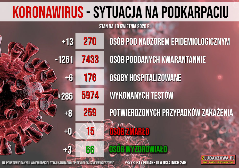 Według danych Wojewódzkiej Stacji Sanitarno-Epidemiologicznej w Rzeszowie na dzień dzisiejszy (18.04) nie ma osób objętych nadzorem epidemiologicznym (bez zmian) natomiast 272 jest poddanych kwarantannie domowej (spadek o 36). Do tej pory stwierdzono 2 przypadki zakażenia - u młodej kobiety z gminy Stary Dzików oraz mężczyzny w średnim w wieku z gminy Wielkie Oczy. Niestety zakażona 32-letnia kobieta z gminy Stary Dzików zmarła 30 marca w szpitalu w Łańcucie. Dobra wiadomość jest taka, że wyzdrowiał mieszkaniec gminy Wielkie Oczy, który przebywał w szpitalu w Łańcucie. Zakażenie koronawirusem stwierdzono u mężczyzny 26 marca.