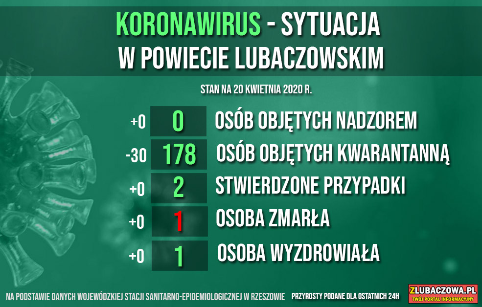Według danych Wojewódzkiej Stacji Sanitarno-Epidemiologicznej w Rzeszowie na dzień dzisiejszy (20.04) nie ma osób objętych nadzorem epidemiologicznym (bez zmian) natomiast 178 jest poddanych kwarantannie (spadek o 30). Do tej pory stwierdzono 2 przypadki zakażenia - u młodej kobiety z gminy Stary Dzików oraz mężczyzny w średnim w wieku z gminy Wielkie Oczy. Niestety zakażona 32-letnia kobieta z gminy Stary Dzików zmarła 30 marca w szpitalu w Łańcucie. Dobra wiadomość jest taka, że wyzdrowiał mieszkaniec gminy Wielkie Oczy, który przebywał w szpitalu w Łańcucie. Zakażenie koronawirusem stwierdzono u mężczyzny 26 marca.