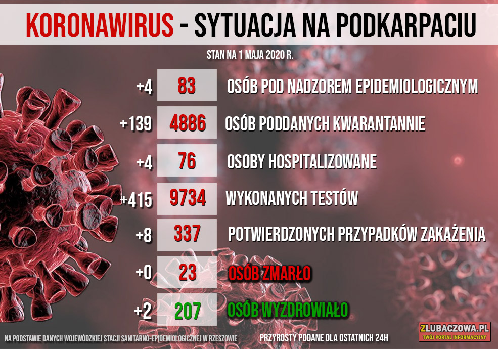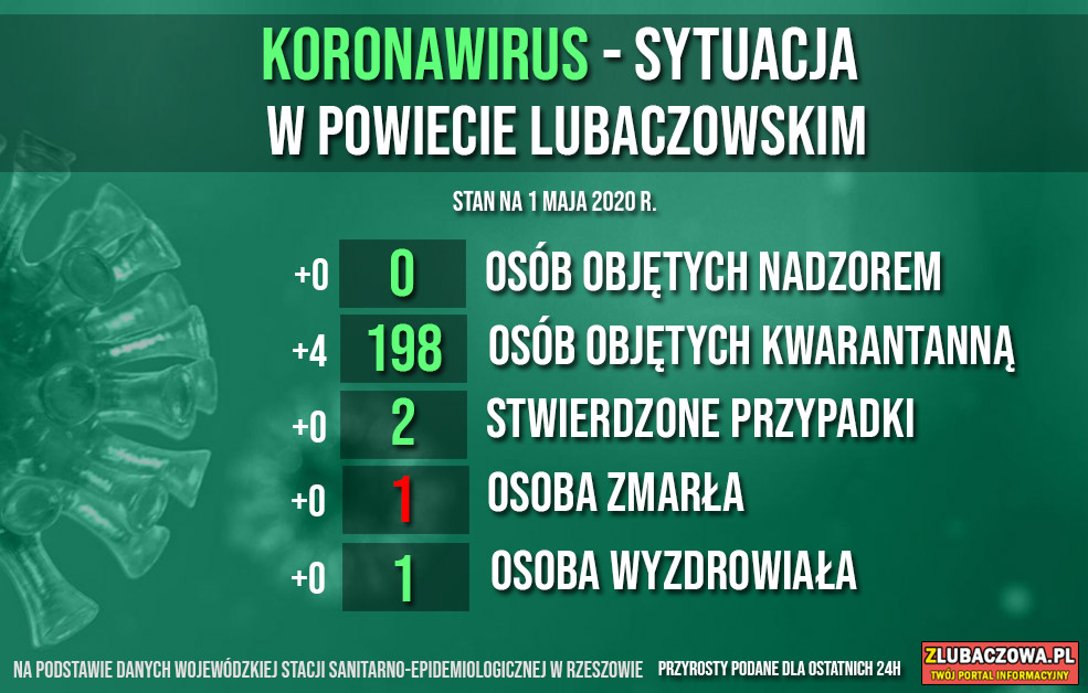 Według danych Wojewódzkiej Stacji Sanitarno-Epidemiologicznej w Rzeszowie na dzień dzisiejszy (01.05) nie ma osób objętych nadzorem epidemiologicznym (bez zmian) natomiast 198 jest poddanych kwarantannie (wzrost o 4). Do tej pory stwierdzono 2 przypadki zakażenia - u młodej kobiety z gminy Stary Dzików oraz mężczyzny w średnim w wieku z gminy Wielkie Oczy. Niestety zakażona 32-letnia kobieta z gminy Stary Dzików zmarła 30 marca w szpitalu w Łańcucie. Dobra wiadomość jest taka, że wyzdrowiał mieszkaniec gminy Wielkie Oczy, który przebywał w szpitalu w Łańcucie. Zakażenie koronawirusem stwierdzono u mężczyzny 26 marca.