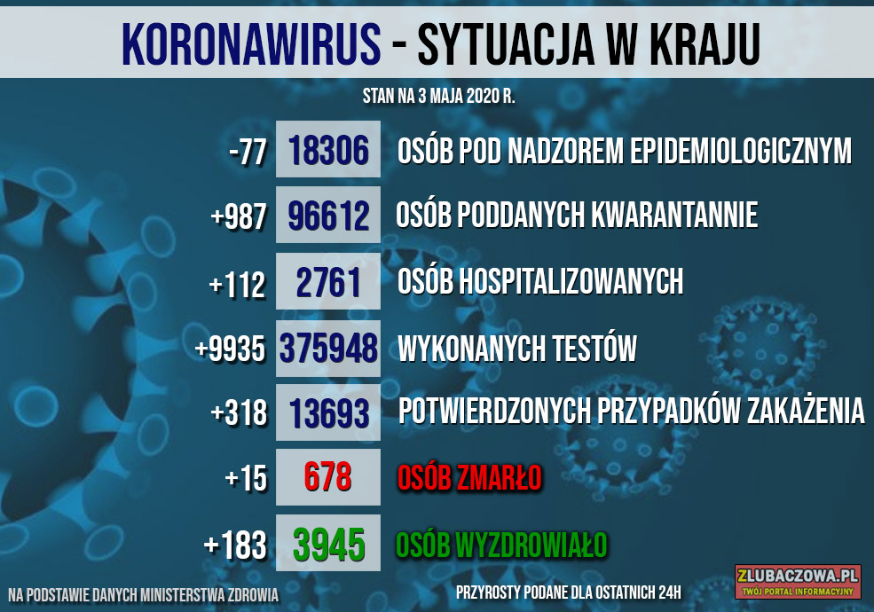 Mamy najnowsze dane dotyczące koronawirusa w naszym powiecie, na Podkarpaciu oraz w kraju. W niedzielę (03.05) w województwie podkarpackim potwierdzono 9 przypadków zakażenia. Zmarła jedna osoba, natomiast wyzdrowiało 8.