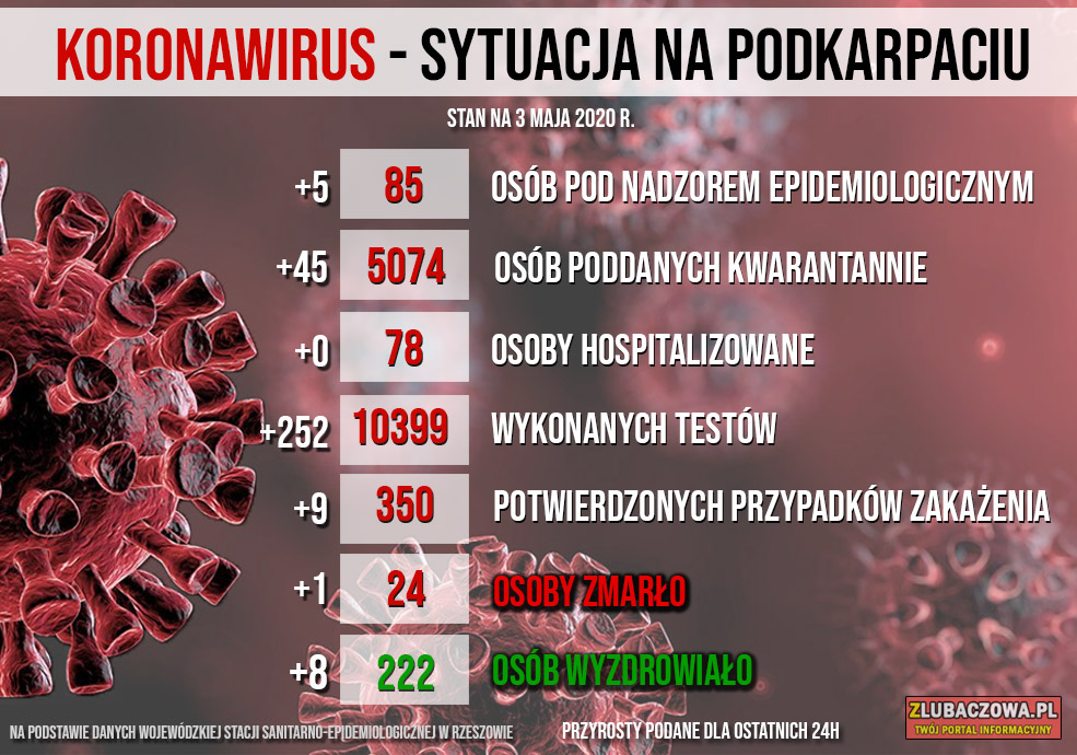 Według danych Wojewódzkiej Stacji Sanitarno-Epidemiologicznej w Rzeszowie na dzień dzisiejszy (03.05) nie ma osób objętych nadzorem epidemiologicznym (bez zmian) natomiast 215 jest poddanych kwarantannie (spadek o 4). Do tej pory stwierdzono 2 przypadki zakażenia - u młodej kobiety z gminy Stary Dzików oraz mężczyzny w średnim w wieku z gminy Wielkie Oczy. Niestety zakażona 32-letnia kobieta z gminy Stary Dzików zmarła 30 marca w szpitalu w Łańcucie. Dobra wiadomość jest taka, że wyzdrowiał mieszkaniec gminy Wielkie Oczy, który przebywał w szpitalu w Łańcucie. Zakażenie koronawirusem stwierdzono u mężczyzny 26 marca.