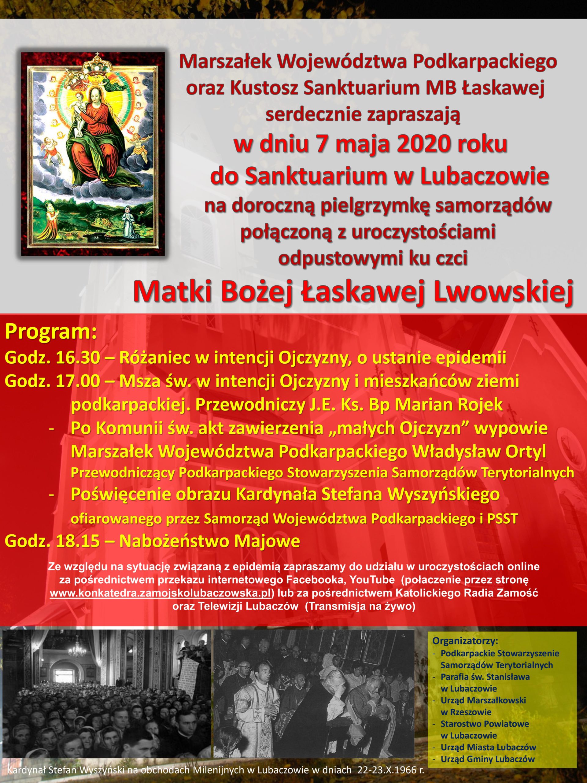 Marszałek Województwa Podkarpackiego oraz Kustosz Sanktuarium MB Łaskawej w Lubaczowie zapraszają 7. maja do Sanktuarium w Lubaczowie na doroczną pielgrzymkę samorządów, połączoną z uroczystościami odpustowymi ku czci Matki Bożej Łaskawej Lwowskiej.