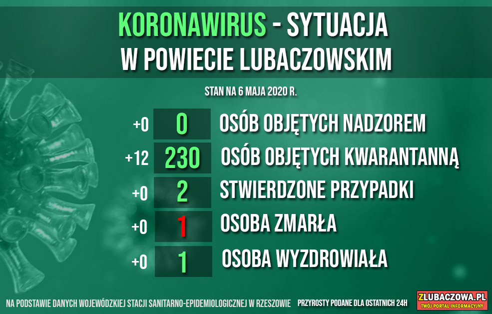 Według danych Wojewódzkiej Stacji Sanitarno-Epidemiologicznej w Rzeszowie na dzień dzisiejszy (06.05) nie ma osób objętych nadzorem epidemiologicznym (bez zmian) natomiast 230 jest poddanych kwarantannie (wzrost o 12). Do tej pory stwierdzono 2 przypadki zakażenia - u młodej kobiety z gminy Stary Dzików oraz mężczyzny w średnim w wieku z gminy Wielkie Oczy. Niestety zakażona 32-letnia kobieta z gminy Stary Dzików zmarła 30 marca w szpitalu w Łańcucie. Dobra wiadomość jest taka, że wyzdrowiał mieszkaniec gminy Wielkie Oczy, który przebywał w szpitalu w Łańcucie. Zakażenie koronawirusem stwierdzono u mężczyzny 26 marca.