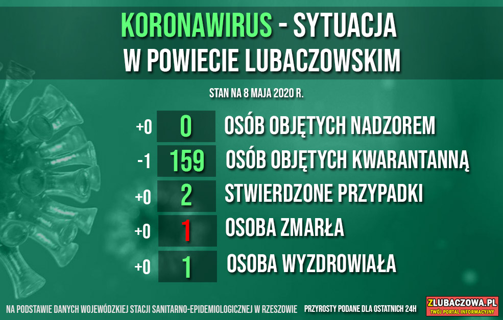 Według danych Wojewódzkiej Stacji Sanitarno-Epidemiologicznej w Rzeszowie na dzień dzisiejszy (08.05) nie ma osób objętych nadzorem epidemiologicznym (bez zmian) natomiast 159 jest poddanych kwarantannie (spadek o 1). Do tej pory stwierdzono 2 przypadki zakażenia - u młodej kobiety z gminy Stary Dzików oraz mężczyzny w średnim w wieku z gminy Wielkie Oczy. Niestety zakażona 32-letnia kobieta z gminy Stary Dzików zmarła 30 marca w szpitalu w Łańcucie. Dobra wiadomość jest taka, że wyzdrowiał mieszkaniec gminy Wielkie Oczy, który przebywał w szpitalu w Łańcucie. Zakażenie koronawirusem stwierdzono u mężczyzny 26 marca.