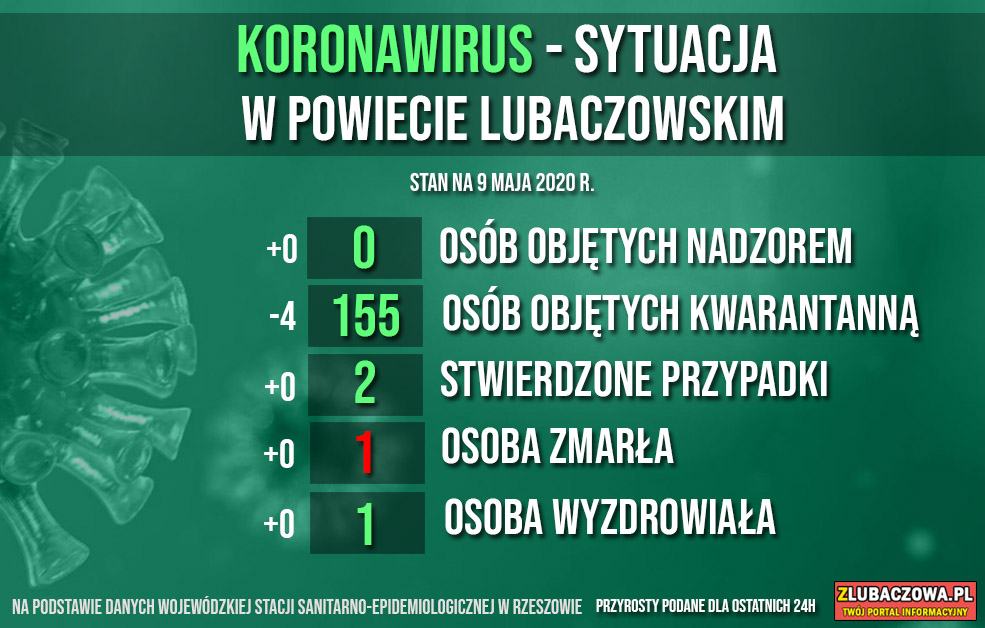 Według danych Wojewódzkiej Stacji Sanitarno-Epidemiologicznej w Rzeszowie na dzień dzisiejszy (09.05) nie ma osób objętych nadzorem epidemiologicznym (bez zmian) natomiast 155 jest poddanych kwarantannie (spadek o 4). Do tej pory stwierdzono 2 przypadki zakażenia - u młodej kobiety z gminy Stary Dzików oraz mężczyzny w średnim w wieku z gminy Wielkie Oczy. Niestety zakażona 32-letnia kobieta z gminy Stary Dzików zmarła 30 marca w szpitalu w Łańcucie. Dobra wiadomość jest taka, że wyzdrowiał mieszkaniec gminy Wielkie Oczy, który przebywał w szpitalu w Łańcucie. Zakażenie koronawirusem stwierdzono u mężczyzny 26 marca.