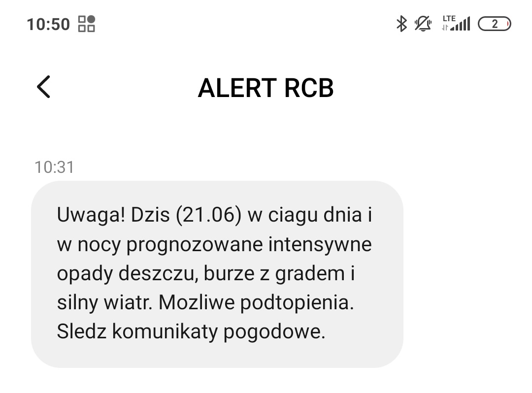 Dzisiaj mieszkańcy naszego powiatu otrzymali SMS od RCB o następującej treści: