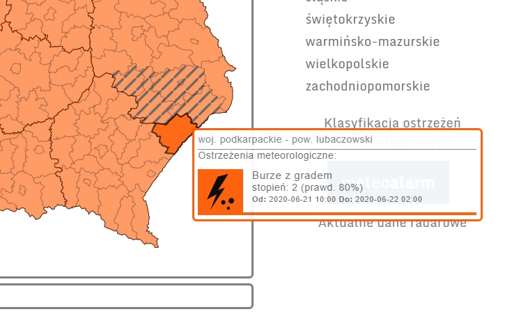 Uwaga! Dziś (21.06) w ciągu dnia i w nocy prognozowane intensywne opady deszczu, burze z gradem i silny wiatr. Możliwe podtopienia. Śledź komunikaty pogodowe.